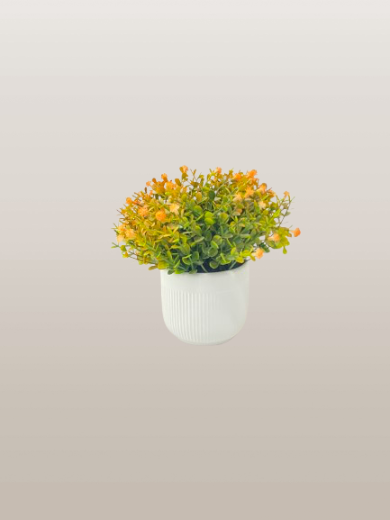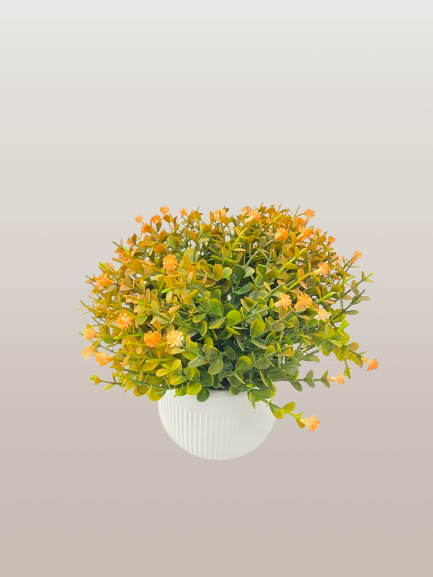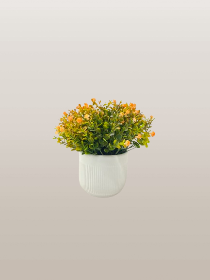 plant mein choti choti orange flowers aur ghane green leaves lage hue hain jo natural aur soft feel dete hain. Iska stylish white ribbed design pot modern aur minimal interior ke sath perfectly match karta hai.