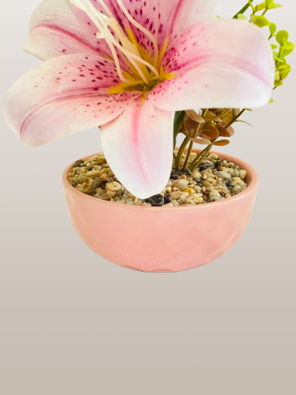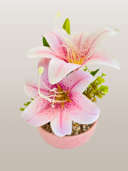 Is arrangement mein beautifully crafted pink lily flowers hain jin par detailed petal shading aur natural-style stamens diye gaye hain, jo isay realistic aur eye-catching look dete hain. Fresh green leaves aur pebble base isay aur bhi natural feel dete hain.
