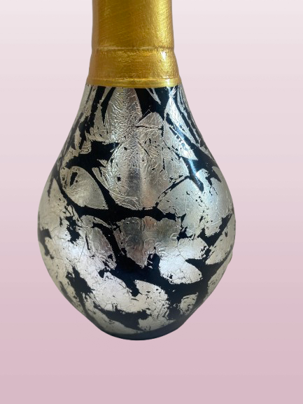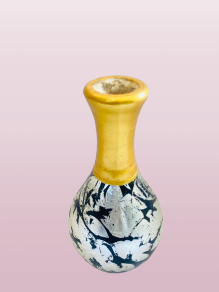 Is vase ka upper part shiny golden finish mein hai jo luxurious look deta hai, jab ke lower body par abstract black & white artistic pattern bana hua hai — jo isay modern aur unique style deta hai.