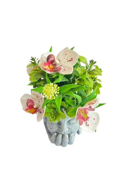 Yeh beautiful pot face shape design mein bana hua hai jisme hands chin ke neeche support ki position mein hain, jo isay ek creative aur eye-catching look deta hai. Upar colorful artificial flowers aur fresh green leaves lage hue hain jo natural aur premium feel dete hain.