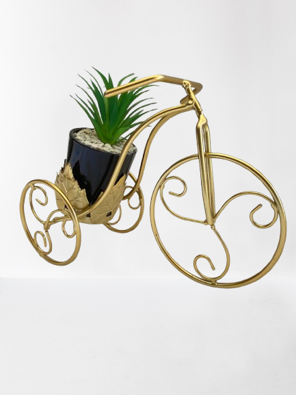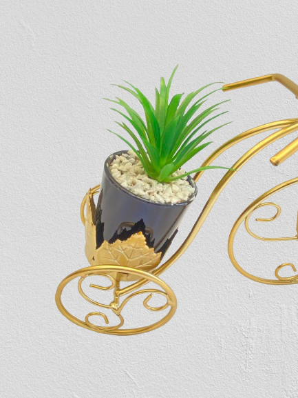 Yeh beautifully crafted golden metal cycle design ek creative statement piece hai jo instantly attention grab karta hai. Iske back side par stylish black pot aur artificial green plant diya gaya hai jo natural freshness ka feel deta hai.