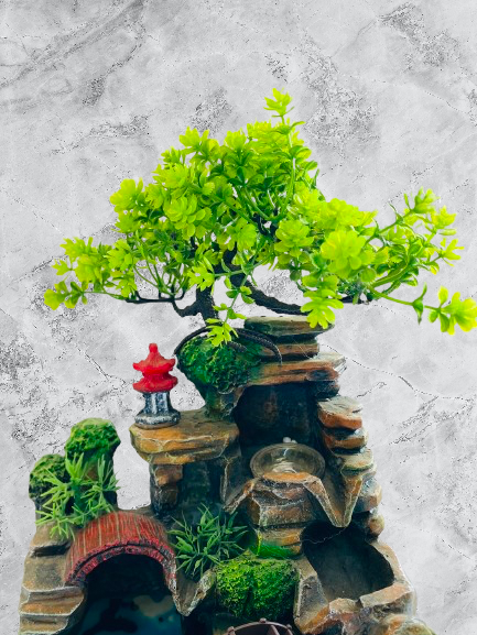 Is beautiful design mein green tree top, stone-style waterfall, chhota bridge, aur rotating water wheel ka combination hai jo ek realistic garden scene create karta hai. Flowing water ki soft sound stress kam karti hai aur environment ko calm banati hai